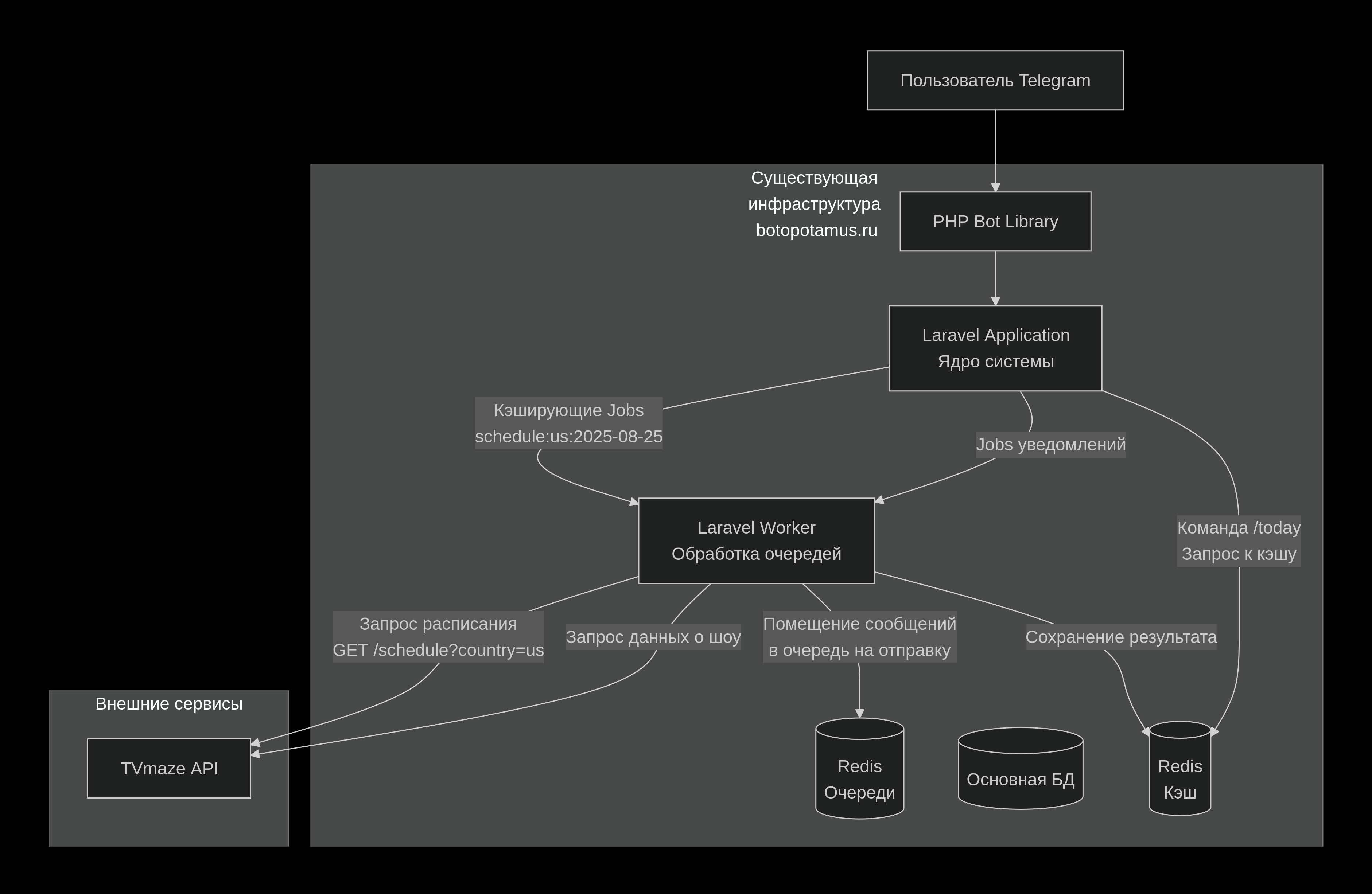Поскольку телепрограмма для всех одна, а меняется редко, парсить её на каждый запрос пользователя смысла нет. Поэтому бот тихонечко (4 раза в сутки) ставит в очередь задачу спарсить данные за текущий месяц. Забирает расписания по дням, сразу отфильтровывает ненужное, строит анонсы по датам и список премьер/возвратов на месяц. И кладёт в кэш.